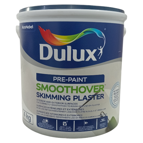 Dulux Smoothover Skimming Plaster | White, 4kg is a ready‑mixed skimming plaster designed to provide a perfectly smooth finish to rough or uneven surfaces. Suitable for both interior and exterior use, it adheres strongly to plaster and cement rendering, setting hard in about 4 hours to a weather‑resistant, alkali‑resistant finish.