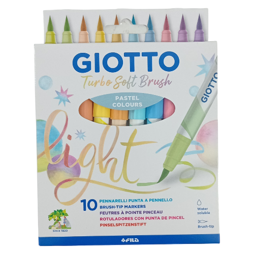 Giotto Turbo Soft Brush Markers | Pastel Colours, 10pc are premium water‑soluble markers designed to deliver soft pastel tones with versatile brush tips. They adapt to fine detailing or bold strokes, making them essential for creative lettering, drawing, and shading projects.