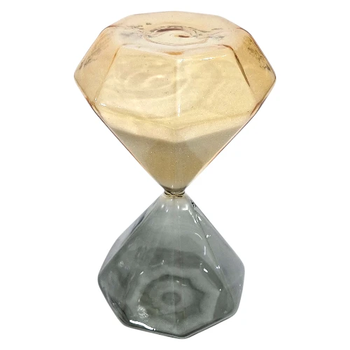 This hourglass blends geometric elegance with practical function. The diamond-shaped glass chambers create a sculptural silhouette, while the warm yellow and smoky grey tones offer visual contrast. As the cream-colored sand flows from top to bottom, it marks a calming 10-minute interval—perfect for focused work sessions, mindfulness breaks, or simply adding a refined touch to your space.