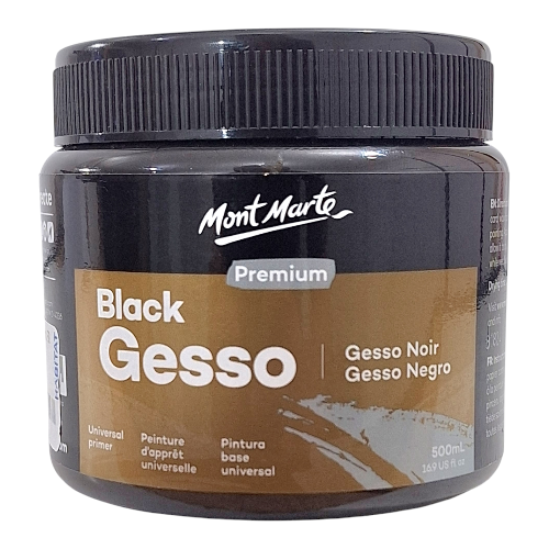 Mont Marte Gesso Universal Primer | Black, 500ml is a water-based surface preparation medium designed to seal and prime porous surfaces for painting. Its flexible matte finish creates a slightly toothed surface that improves paint adhesion and supports detailed brushwork. Ideal for canvas, wood, paper, and card, this primer can be applied in thin coats and sanded between layers for a smooth base. The black colour adds contrast and depth, making it especially useful for dramatic compositions or layered effects.