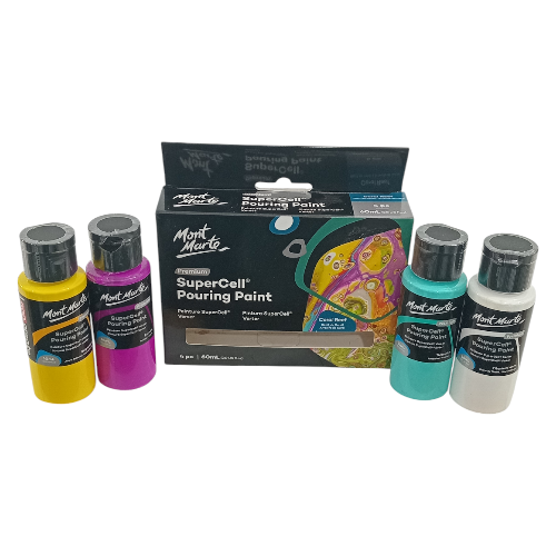Mont Marte SuperCell Pouring Paint Set | Acrylic Cell delivers effortless cell effects and lacing with advanced SuperCell® technology. The pre‑mixed formula eliminates the need for mediums, offering vibrant pigments and smooth flow straight from the bottle. With its curated Coral Reef palette, this 4‑piece set inspires ocean‑themed creations while ensuring professional results for artists of all skill levels. Reliable and ready‑to‑use, it transforms fluid art projects into striking, long‑lasting masterpieces.