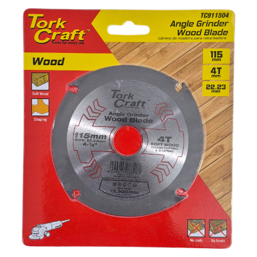 The Tork Craft Angle Grinder Wood Blade is engineered for precision and speed in woodworking projects. Its aggressive 4-tooth design ensures rapid material removal, making it ideal for shaping and rough cutting soft wood. With compatibility across most angle grinders and high-speed performance up to 13,300 RPM, it delivers consistent results when used on clean wood surfaces.