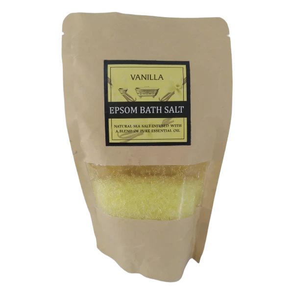 This Vanilla Epsom Bath Salt offers a natural way to enhance bath time. This product, moreover, combines the therapeutic properties of natural sea salt with the comforting aroma of pure vanilla essential oil, providing a luxurious and beneficial soak.